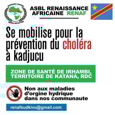 Pour lutter contre la propagation du choléra et autres maladies hydriques au Sud-Kivu, nous avons pour projet de déployer des agents de sensibilisation (formés en continu) dans des zones ciblées. Nous souhaitons sensibiliser les communautés aux risques de contamination et promouvoir des gestes d'hygiène au quotidien, notamment le traitement de l'eau. Nous avons également pour ambition de distribuer des kits WASH aux populations locales.
